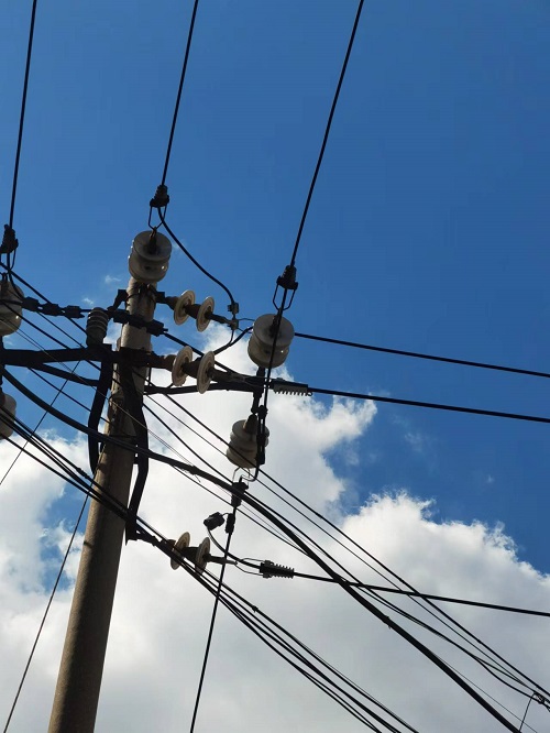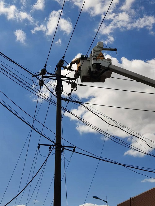 2024年9月22日,勝園供電所市區(qū)線工商局支線02號(hào)桿帶電處理中項(xiàng)導(dǎo)線放電故障,絕緣包裹導(dǎo)線及金具。下面是施工現(xiàn)場(chǎng):